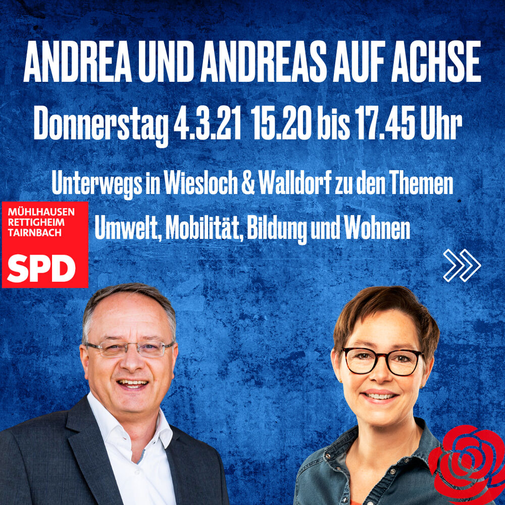 Der Spitzenkandidat Andreas Stoch und die Landtagskandidatin Andrea Schröder-Ritzrau sind zu den 4 Themen Umwelt, Mobilität, Bildung und Wohnen am 04.03.2021 im Wahlkreis in den Orten Wiesloch und Walldorf unterwegs. Man trifft sich am Mobilitätsherz der Region, dem Bahnhof Wiesloch-Walldorf und fährt von dort mit dem Rad verschiedene Stationen ab. Es wird um bezahlbares und ökologisches Wohnen in einem geplanten Neubaugebiet in Wiesloch gehen. Das Thema gebührenfreie Kitas wird aufgegriffen – hierzu wird es kontaktlose Info-Stände auf dem Marktplatz Wiesloch und in Walldorf an der Neuen Heimat geben; jeweils ab 14:00. Auch das Thema „Gute Schule“ wird im Verlauf der Tour aufgegriffen. Das ist ein sportlicher Plan mit einem sportlichen Fortbewegungsmittel, dem Fahrrad.